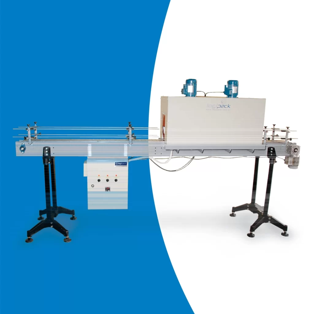 Equipamento destinado ao termoencolhimento de rótulos através de ar quente direcionado, aquecido por resistências elétricas aletadas.
